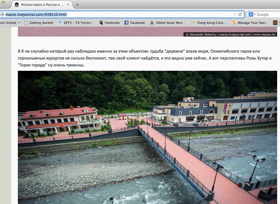 See the pictures by Russian photographer Alexander Belenkiy of Rosa Khutor, one of the main hubs of the “mountain cluster” of the Olympic venues for events like skiing and snowboarding. Vladimir Putin’s government spent US$2 billion to build the Rosa Khutor ski resort, and another $8.7 billion to connect the host town, Krasnaya Polyana, by road and rail to the Game’s other events in the coastal areas.